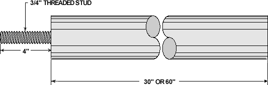 The typical "heater treater" anode is a 3" diameter cast anode with a length of either 30 or 60 inches. A 3/4" diameter all-thread rod is cast into the center of the anode and extends outside the anode from either one or both ends. It is this configuration that is then converted to a number of different mounting or installation methods as follows: