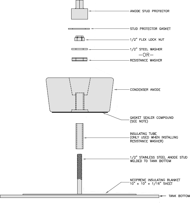 If using a “resistance washer” in the installation, slide the rubber insulating tube over the anode stud until it comes in contact with the rubber sheet installed per item 3 above. If you’re not using a resistance washer in the installation, do not install the rubber insulating tube.