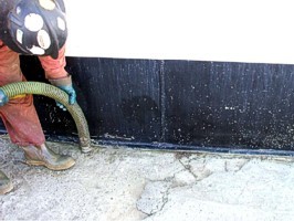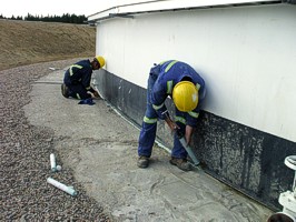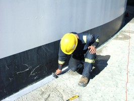 Inspect your work. Check if the EZ Wrap shows good adhesion at the concrete ring and the steel. This can be done by peeling the edges of the tape and see if the material bonds completely. Complete adhesion takes place after a while, so a time slot of half an hour after application should be taken into account. The edge of the tape should end exactly at the corner of the shell and floor plate. A minimum overlap of 2 inches should be achieved on the concrete ring. The amount Amcorr EZ Paste should reflect the average calculated amount and not less. A cut-out can be made of the EZ Wrap to check the fill. 1 inch deep should be the minimum. After the cut-out, a patch should be made with 1 inch overlap on each side.
