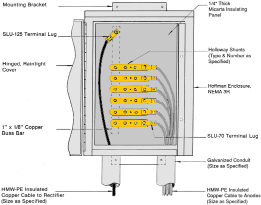 Farwest standard anode junction boxes provide a low-cost solution to consolidate multiple impressed current anode cables and a means for monitoring individual anode currents. Build to last, these junction boxes include a Hoffman powder coated steel enclosure, a Micarta insulating panel, copper buss bar, shunts (customer selected), and mechanical terminal lugs for cable attachment.