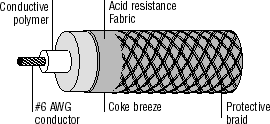 Conductive polymer: 0.5" (13 mm) in diameter special extrusion, sealing the copper conductor from chemical attack, yet allowing current to flow through it, from the conductor to the environment all along its length.
