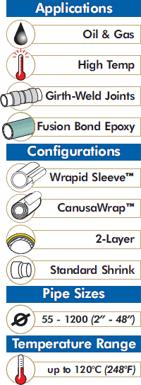 The Canusa-CPS GTS-HT shrink sleeve system provides superior corrosion protection and excellent bonding on FBE coated pipelines operating at temperatures up to 120°C (248°F) (actual rating may vary depending on local requirements).GTS-HT sleeves consist of a thick crosslinked backing coated with a very high shear strength hot-melt adhesive. During installation, the adhesive melts and flows, filling surface irregularities and providing an excellent bond to metal and FBE coating.