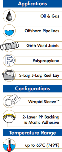 The Canusa GTS-PP-65 hybrid shrink sleeve system provides excellent long-term adhesion and superior mechanical protection properties for subsea pipelines coated with a wide range of anti-corrosion coatings, including 3LPE, 3LPP, FBE, AE and CTE materials.