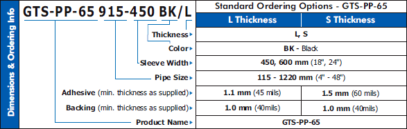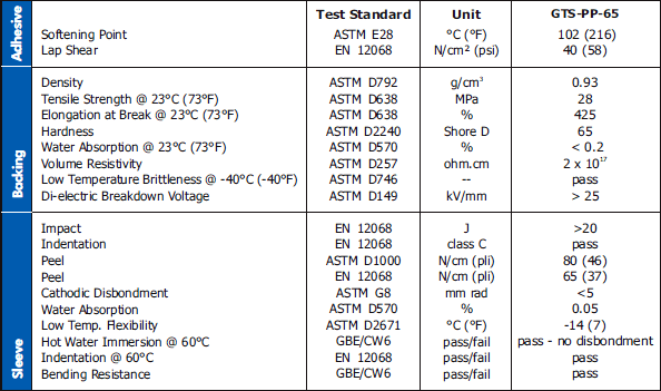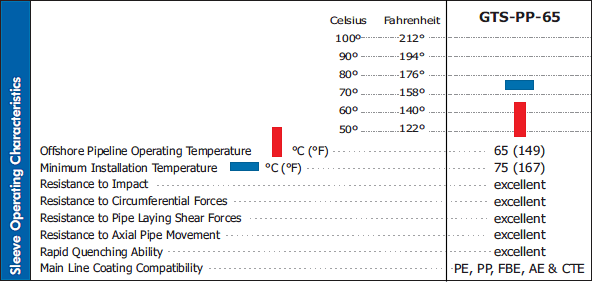 Rapid & Reliable Installation: The GTS-PP-65 is designed specifically for use in offshore environments, where a reliable installation procedure achieved in the most aggressive cycle time is critical. The following features contribute to this key benefits: • Low preheat temperature • St 3 surface preparation • One-piece pre-fabricated design • Rapid recovery PP backing layer (designed for excellent heat resistance to allow for up to four torch operators for installation on large diameters).