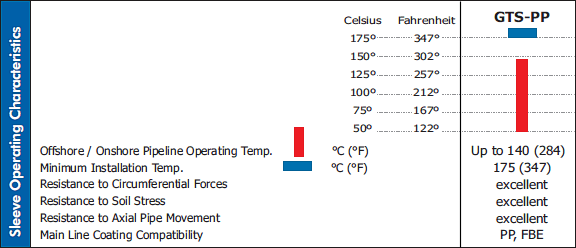 Long-Term Corrosion Protection: GTS-PP provides superior corrosion protection because of the high performance system approach. The epoxy primer / sleeve combination provides protection with the structural integrity of an extruded coating, resulting in excellent resistance to cathodic disbondment and excellent durability against abrasion and chemical attack. The result is effective, long-term protection against corrosion.