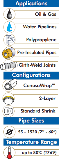 Easy Field Installation: CanusaWrap™ can be installed quickly and easily in most environments. Since no special taping, priming or operator equipment is required, product installation is quick and labor costs are kept to a minimum. CanusaWrap™ and the closure seals are available in yellow with a thermochromic indicator and a patented Windoweld feature which visually confirms optimum installation.