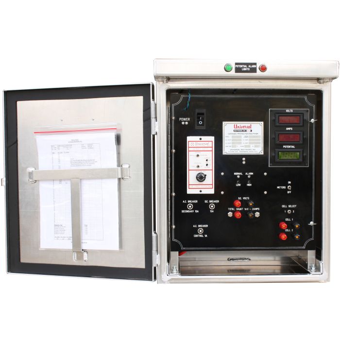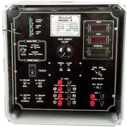 Farwest “W” series auto-potential controlled cathodic protection rectifiers,manufactured by Universal Rectifiers, Inc., are specifically designed for the Water Tank Industry. Proven, dependable solid state control boards maintain strict “Standard On” or “I.R.Free” potentials. Easy-to-read, bright LED digital meters provide accurate readings of volts, amps and potentials. These compact, light-weight rectifiers can easily be mounted on tank walls or posts by one person.