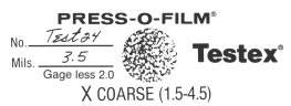 X-COARSE PLUS: (4.6 TO 5.8 MILS / 116 TO 147 MICRONS)Complete Press-O-Film Kits contain one Testex Thickness Gauge, one Roll Coarse Film, one Roll XCoarse Film, one Burnishing Tool, and complete instructions for use.