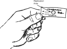 Step One: Prepare and Position the Tape Remove the release paper and bulls-eye that covers the pressure-sensitive tape and the replication film. With the small square of white film facing down, position the tape strip on the surface to be measured. Rub a finger over the entire tape area to set the adhesive and avoid movement during replication.