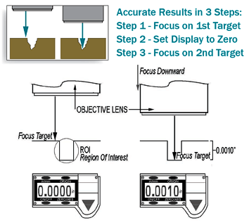 - Step 3 is to focus on the second ROI, the bottom of the scratch or pit. When the second ROI is in sharp focus, the depth of the scratch (distance between the two points) is shown on the digital LCD display.
