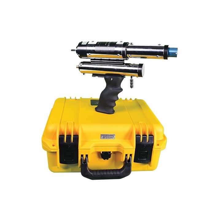 The model EXL7000 Extension Lance connects directly to your ZE7000 Pin Brazing Gun to allow the gun to be used for down-hole cable connections.  The lance system features four independently connecting, 1 meter long (39”) sections and an independent remote trigger device. The lance system is provided with a military grade Pelican case.