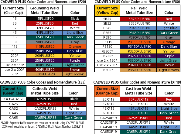 CADWELD PLUS will use the following color codes and general product nomenclature: Gram weight PLUS weld metal type, i.e., 45PLUSF20