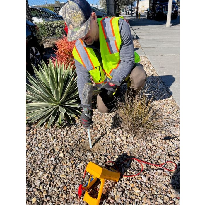 The Farwest model AC-10 portable steel coupon/probe is the answer to this issue. Used much like a portable reference electrode and similar to a soil pin, the coupon is driven into the soil and functions like a permanent AC current density coupon. Since it’s portable, the AC-10 coupon/probe allows the CP technician a method of measuring AC current density on demand or during a normal pipeline corrosion survey.