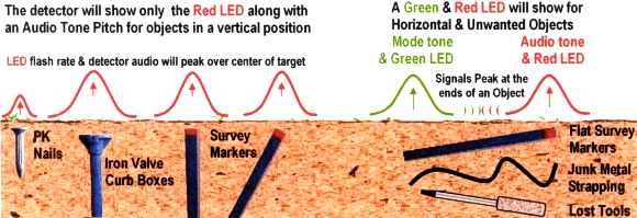 Setting 1: The detector performs as a basic magnetic locator. All Signals from ferrous metal objects, vertical or horizontal will be indicated with an AUDIO TONE and RED LED. Note: No GREEN LED will show in Setting 1.