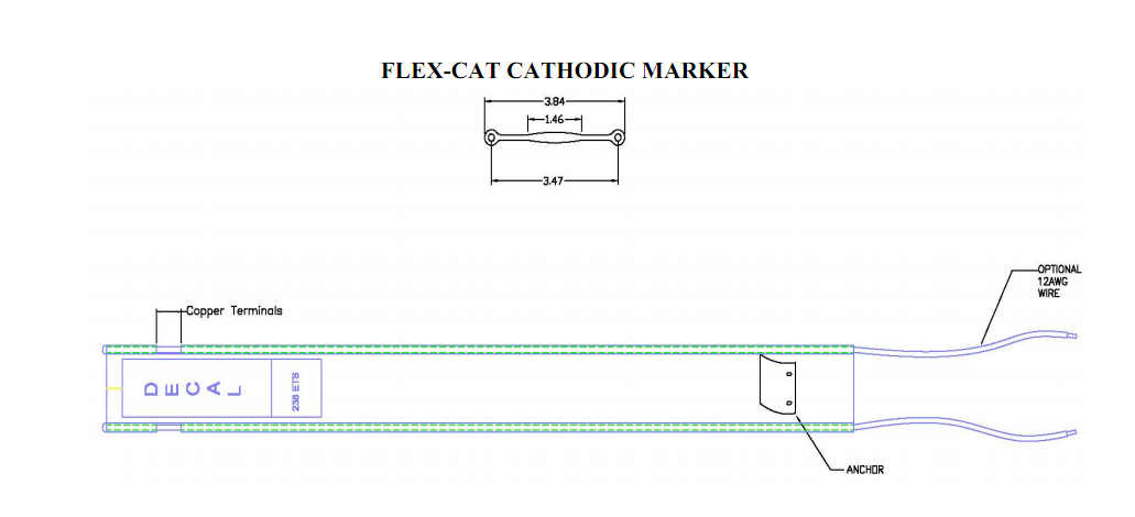 A modified version of the Flex-Tough marker that provides flexibility and impact resistance while serving as a two terminal cathodic protection test station. Includes one standard two color vinyl decal, anchor, copper terminals and one standard cathodic protection decal (238ETS).