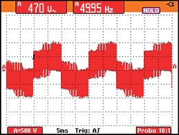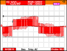 Pulse-width modulated detail of 50 Hz motor drive output voltage. 1000 V, 50 µs can cause erratic behavior in some test equipment.