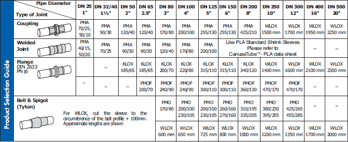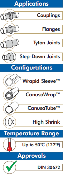 Flexible & Reliable Installation: 1) The patented Wrapid Sleeve™ (K) incorporates a one-piece pre-attached closure strip that has been factory applied resulting in quick and reliable field installation. 2) The CanusaWrap™ (W) configuration is supplied in a bulk roll, with separate closure seals, providing just-in-time customized lengths. This flexibility results in reduced inventories and cost savings on the job site. 3) The CanusaTube™ (P) consists of a unique tubular configuration that has been factory constructed, resulting in quick and reliable field installation.