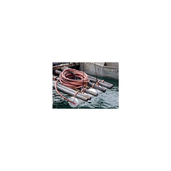 Each 4884S Z anode has a single #8 HMWPE cable lead connected to a shore-based rectifier (not included) by means of two, parallel insulated cables (usually, but not limited to, #6, #4 or #2 HMWPE) protected by heavy-wall EPDM rubber hose. Dual cables of #2 or smaller may be protected by a single hose, depending on the length required. The maximum length of shore lead cable that can be installed in-hose is 350’ (107 m).