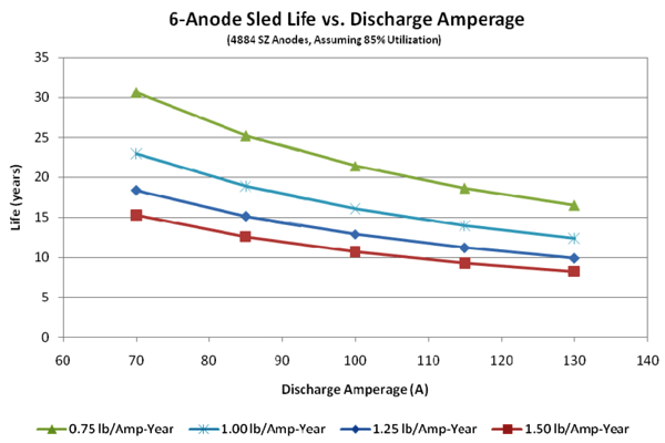 Based on the above assumptions, the charts depicts 6-Anode Sled Life in relation to sled discharge amperage for the consumption rate range.