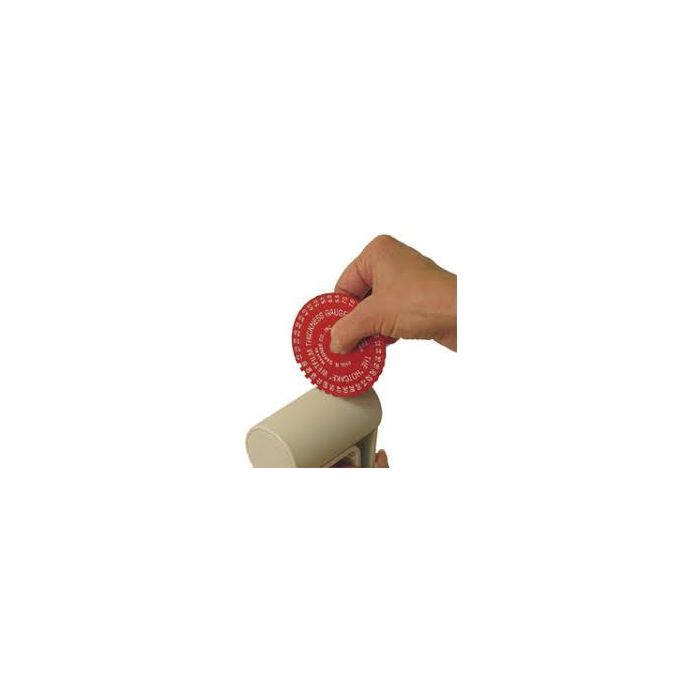 The "HOTCAKE" gauge consists of a circular aluminum disk with spaced, calibrated notches, and recessed flat surfaces below the rim. The hole in the center allows the thumb and index finger to hold the gauge and roll it over easily across the wet paint film to be measured. The outer rim of the disc is completely wetted, while the inner flats, at depths from 1-100 mils (.001"-.100") are only wetted according to the thickness of the wet paint film.