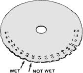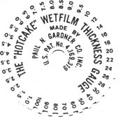The "HOTCAKE" Wet Film Thickness Gauge (U.S. Patent 4,169,319) is so called because it is round and flat. It is an inexpensive, precision made gauge designed for on-the-job measurements of the wet film thickness of applied paints. The gauge is versatile since it can measure wet paints on objects of practically any size and shape.