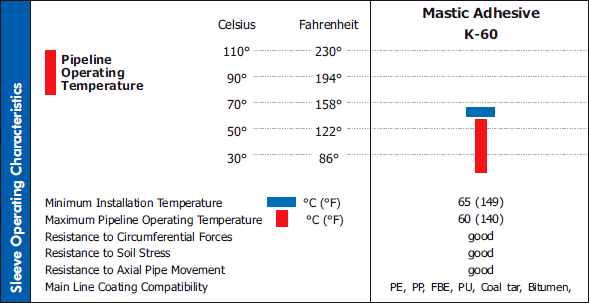 - Long-Term Corrosion Protection: K-60 provides excellent resistance to cathodic disbondment resulting in effective long term corrosion protection. Once installed, K-60 provides the structural integrity of a seamless tube, and provides the substrate with durable protection against abrasion and chemical attack.