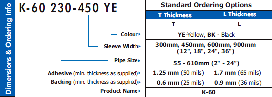 - Rapid & Reliable Installation: K-60 has a patented one-piece Wrapid Sleeve™ construction that incorporates a pre-attached closure strip as part of the sleeve. Because the closure has been factory applied, quick and reliable field installation is easy to accomplish. For added flexibility, CanusaWrap™ two-piece cut sleeves or bulk rolls are also available. K-60 is supplied with a yellow polyethylene backing for buried pipelines or a black backing with added UV resistance for above ground pipelines.