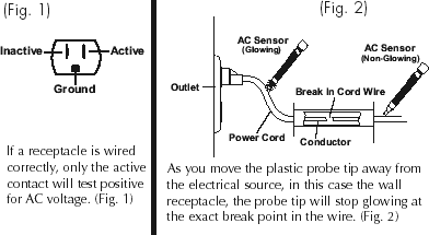 It is not necessary to disconnect the system in question. Electrical contact is not required for operation, and current flow is not necessary to locate voltage. Simply touch the plastic tip to a connection point or move it along an insulated wire. If AC voltage is present, the tip will glow red, and you will hear an audible tone. The illumination will stop at a break in the circuit or wire and this allows the AC Sensor to he used as a troubleshooting instrument.