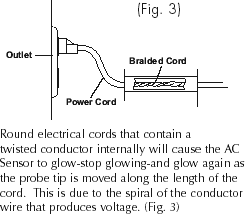 Caution 2. In testing indoor insulated cable where the fibrous filler becomes saturated with water, which is conductive, an electrical connection is formed between the filler and the ground circuit. The length of cable that has become wet is essentially shielded. If a voltage is present on a conductor in this cable, the electric field normally radiated by the voltage will be attenuated by this shielding, and the AC Sensor may not glow even though a voltage is present.