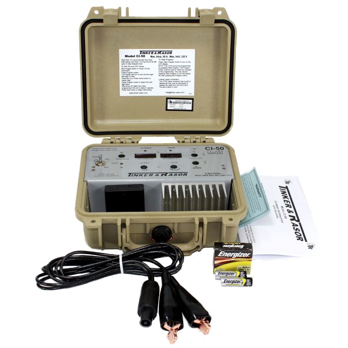 The new Tinker & Rasor CI-50 Current Interrupter is shipped ready to use. It is housed in a heavy duty aluminum case and is designed for rugged field use. The front panel allows access to the sturdy terminal lugs for quick and easy clamping. The Cl-50 has the latest integrated circuitry construction for long life expectancy in field environments.The Cl-50 Current Interrupter has a timing span range from 5 to 45 seconds in any combination through the continuous range function controls. The operating weight is only 6 pounds (approximately 2 pounds without a battery). The Cl-50 uses a readily available 12 volt lantern battery.