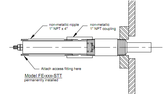 The Model FE is designed to operate in extreme environments with high temperatures, high pressures and / or contaminated electrolytes where ordinary reference electrodes cannot survive. A permanent bridge is installed at each location where potential readings are desired. The reference element is contained in a separate housing which isolates it from the aggressive environment; this substantially increases its service life. When continuous readings are required, the reference is threaded into the bridge. For intermittent readings, the reference is simply pressed into the bridge. This allows a single reference to be used with several bridges. Further details are shown on the following pages.