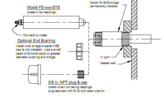 In a temporary installation, the reference electrode is inserted into the bridge whenever a potential measurement is required. In between readings, the 3/8" pipe plug must be installed in the bridge; at pressures over 50 psi, the 1" end cap must also be used. If the plug and cap are installed without any joint compound or gaskets, the bridge will leak slightly to relieve the pressure buildup. If a leak-free installation is required, use Teflon tape or a non-hardening Teflon pipe dope on the threads.