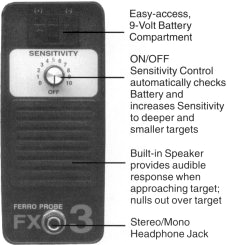 When the FX-3's two sensors come across a large, ferrous object, the FX-3 signal tone increases in pitch and volume. When the FX-3 probe is directly over the target, the signal becomes silent and picks up again when moved past the target.