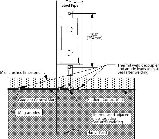 To assure long life of the galvanized steel gradient control mat in all soil conditions, DEI has commissioned Correng Consulting to provide guidelines for cathodically protecting the mat using readily available magnesium anodes. The design life of the anodes protecting the mat is 20 years, as documented in Correng Report COR-05-9508D “Guidelines for Cathodic Protection of Galvanized Steel Gradient Control Mats.”