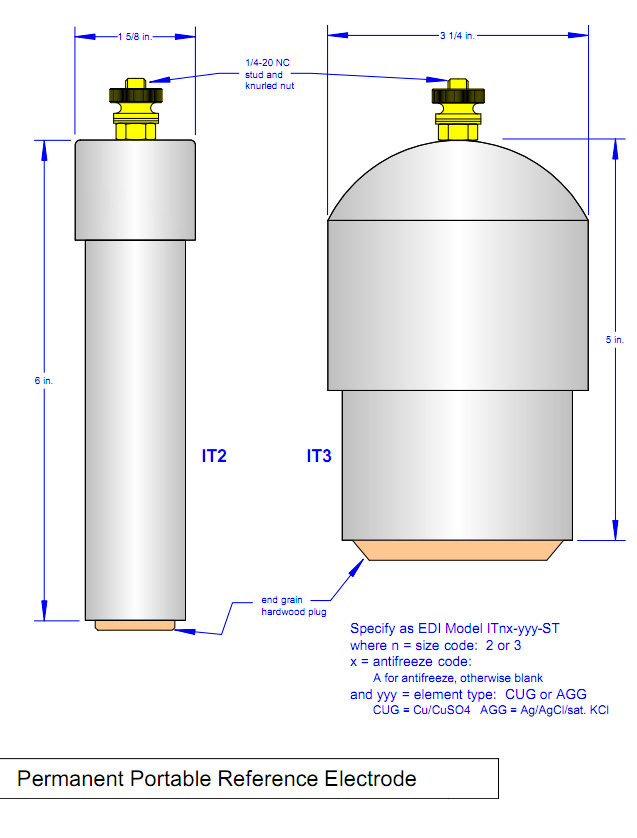 The Model IT is designed to take potential readings in any application where a standard, liquid junction portable reference electrode is presently being used. Because it contains a gel rather than a liquid, it will neither leak nor require any refilling or cleaning. The hardwood plug offers several advantages over the conventional ceramic membrane. It will not clog as readily, it is resistant to salt blockage, and it can be reworked by light sanding or cutting if it becomes contaminated with oil. All units have antifreeze protection in the gel so that they will not be damaged if exposed to temperatures down to -35oF.
