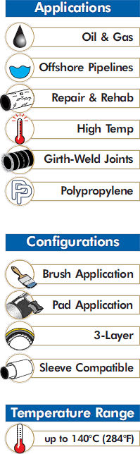 Used for corrosion protection of field welded joints of steel pipes or as an overcoat in multi-layer sleeve systems at temperatures to 140°C (284°F).