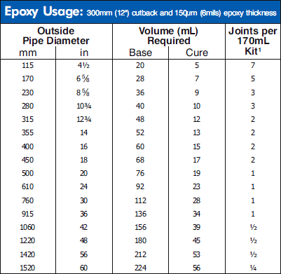 Epoxy required for 300 mm / 12" cutback. For other cutbacks, divide by 12 and multiply by new cutback in inches. Example: 200 mm (8") cutback on 610 mm diameter pipe Base: 92 mL x 8/12 = 62 mL base Cure: 23 mL x 8/12 = 16 mL cure