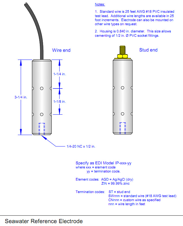 The Model IP is a compact, economical, dry-type reference electrode for marine applications. It has a 0.840 inch diameter PVC bushing on the termination end. This enables the user to cement on any ½ inch socket-end PVC pipe or electrical conduit fitting (e.g. male or female conduit thread or couplings) for permanent installation. Examples of this are shown on EDI Drawing PIPAPP2, where ½ inch PVC couplings serve as transition pieces for running the lead wire through conduit or attaching the electrode to a wall. For intermittent use, the Model IP has a blind 1/4-20 hole for attaching up to a 5 lb weight. Should more weight than that be necessary, the electrode and the weight should be attached to a separate drop line as shown on EDI Drawing PIPAPP1.