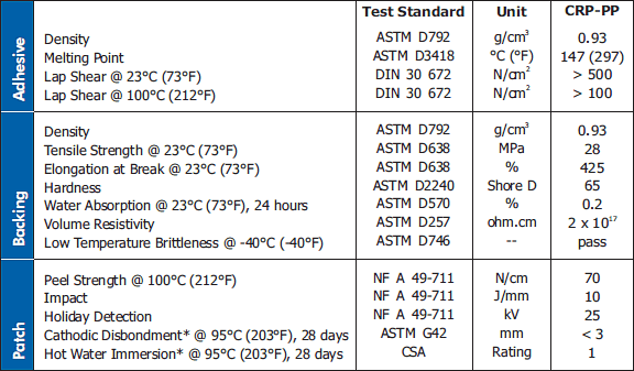 Coating Repair Patch (CRP-PP) is polypropylene based and is designed to be fully compatible with the polypropylene pipeline coating. The patches are supplied pre-cut for easy handling in the field. The installed patch provides a barrier to moisture and corrosion and is resistant to abrasion and shear forces during pipeline construction and while in service.