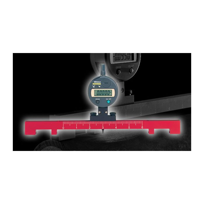 Corrosion profiles can be plotted quickly and accurately by moving the probe and indicator along the bridging bar. Notched feet prevent the bridge from rocking on a rounded surface. Ceramic magnets securely hold the gauge in place -- a definite bonus when working upside-down. The left-handed scale measures increasing depth as the tip drops into the pit. A locking adjustment screw allows instant calibration to a reference surface. Thumbscrews facilitate one-handed operation. -