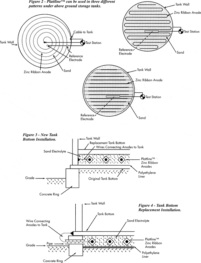 Plattline ™ Zinc Ribbon Anode can be installed in several ways. It can be cut into lengths and connected by a lead wire along the tank bottom or it can be laid out in a spiral or serpentine fashion in a continuous length along the tank bottom. Each of these installation patterns is illustrated in Figure 2 on the next page and takes place in the sand electrolyte which is approximately four to six inches deep.