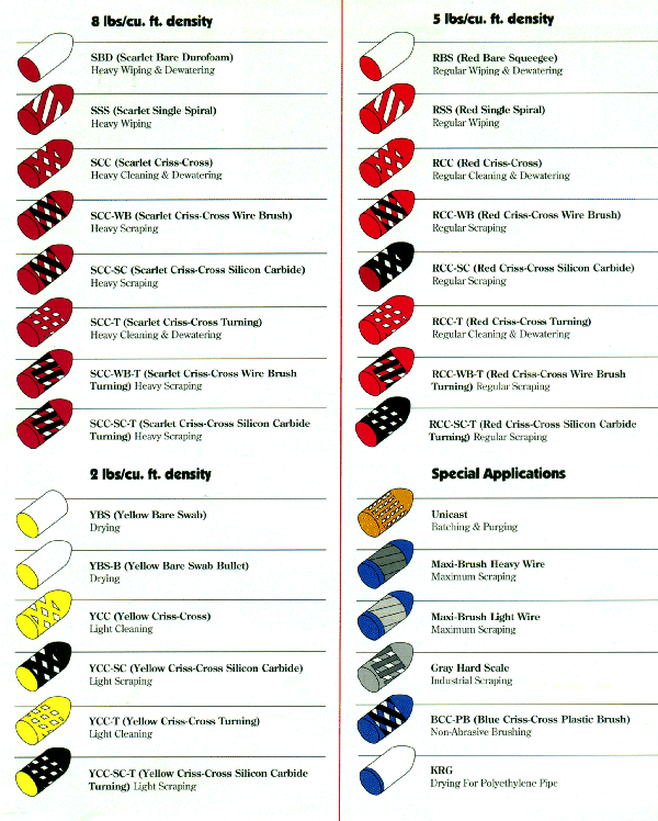 Special Applications - 5, 8, and 20 lbs/cu.ft. density polyurethane foam. Available in 6 styles for batching, special cleaning, and scraping. Custom made Polly-Pigs are also available for special needs. Consult the factory for details and additional literature.