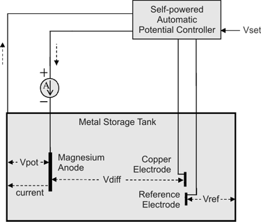 The controller is electrically coupled to the tank via cabling to complete a circuit through which current flows from the anode to the tank. The controller includes a current controller that is automatically adjusted to maintain the desired reference voltage Vref between the system's reference electrode and the tank. By adjusting this current controller, the current flow and thus the voltage potential Vpot between the magnesium anode an the tank are set to the desired value.