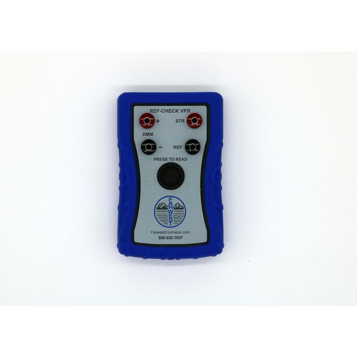 No CP Technician should be without this instrument! Cathodic Protection (CP) solutions require accurate voltage potential or structure-to-soil readings. The Ref-Check VPR is the next step in the Farwest Ref-Check product line designed to overcome false or low potential readings from a cathodic protection reference electrode (CPRE). The Ref-Check VPR can take accurate potential readings even with a compromised CPRE, which no longer requires replacement. You can now trust the provided potential reading even if the CPRE is not performing to original specifications. In addition, the Ref-Check VPR can confirm good contact-to-earth resistance of a portable CPRE and/or CP coupon. The Ref-Check VPR works in conjunction with a standard digital multimeter (DMM) via the included dual banana plug cord. When engaged, the Ref-Check VPR increases the circuit input resistance from 10 million ohms to approximately 5 billion ohms, making it over 500 times more sensitive. This allows a standard DMM to provide much higher accuracy because, with the Ref-Check VPR, it provides near zero meter loading. In addition, when connected to the DMM, the Ref-Check VPR remains out of the circuit until the "Press to Read" button is engaged. This allows a CP technician to leave the Ref-Check VPR connected to the DMM during normal CP testing. BackgroundAll DMMs will impose a load, referred to as "meter loading”, on the CPRE. This load affects CPRE accuracy even under the best conditions. Most professional grade DMMs have a 10 meg (million) ohm input resistance. This may seem high but when used to measure very sensitive (high resistance) circuits, such as a compromised reference electrode (due to age or lack of moisture), the meter imposes a load on the circuit that can result in a very large structure-to-electrolyte potential error.