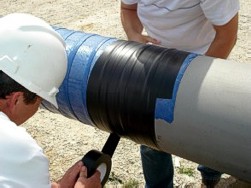 Apply heavy duty 20 mil outer wrap for underground pipelines by wrapping under tension in the direction counter to Viscotaq Coat Wrap ST.
