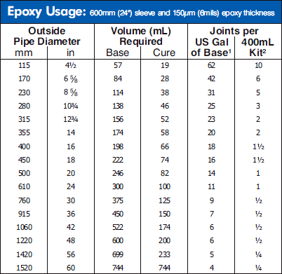 Small diameter ø represents joints completed with one installer. As a general rule, only one installer is required up to 18” (450 mm) pipe sizes. Latex gloves associated with Bulk Accessories are heavy duty and can be used for more than one joint. For large projects, joint specific pre-measured epoxy quantities (other than standard 400 mL) will be considered.