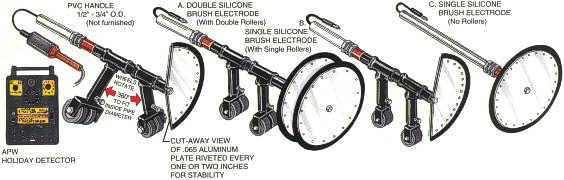 The Internally Conductive Silicone Rubber Brush Electrode is recommended for use in locating holidays on coated surfaces inside pipes using a round Silicone Brush electrode sandwiched by aluminum plates for stability and attached with fittings to your specifications. See the renderings for the type of application you would prefer. Please specify type and precise inside diameter of pipe when ordering.
