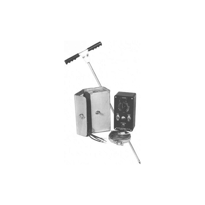 The complete apparatus consists of a 40" calibrated hexagonal steel rod with handles and insulated tip, a compact AC resistivity bridge instrument in a leather carrying case, and an ear set for balancing a bridge by null method. The rod is simply pushed into soil to the desired depth and connected to bridge. AC resistance between the tip and body of rod is determined by balancing bridge and soil resistivities in Ohms-cc read direct on the dial.