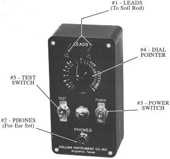 With soil rod inserted in soil to be tested, connect leads to soil rod and binding posts on Model 54-A marked "LEADS" (#1). Plug ear set into jack marked "PHONES" (#2), flip toggle switch (#3) to "ON" position, bring tone to "NULL" by means of dial pointer (#4). The resistance of the soil will be the dial reading in Ohms per cc.
