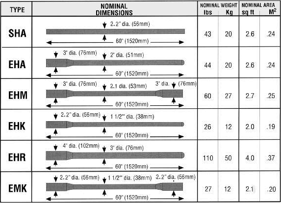 Arealbs (kg) Amps inch (mm) inch (mm) sq ft (m2) STICK SHA, EHA 44 (20) 2.0 - 2.6 2 (50) 60 (1520) 2.6 (.24) EHM 60 (27) 2.0 -2.7 2 (50) 60 (1520) 2.7 (.25) EHK 26 (12) 1.5 - 2.0 3 (50) 60 (1520) 2.0 (1.9) EHR 110 (50) 3.0 - 4.0 3 (76) 60 (1520) 4.0 (.37) Note: Maximum amperage based on maximum value in manufacturer publications, 15-year minimum life criterion (0.7 lb/amp-year of 0.31 kg/amp-year) at 80% utilization, or 1 amp/sq ft (10.8 amp/m2).